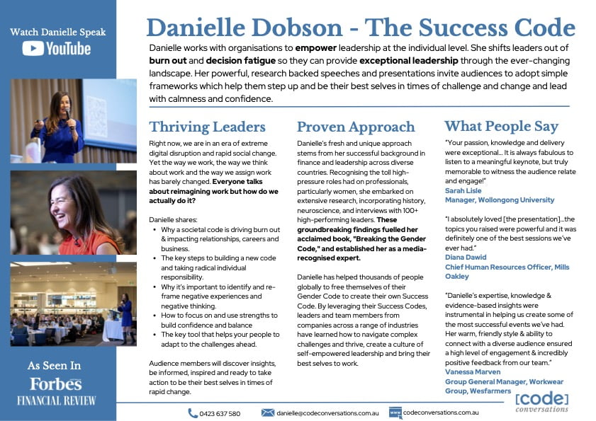 Drawing from her groundbreaking research featured in Breaking the Gender Code, Danielle delivers tailored, action-oriented presentations that leave a lasting impact. By focusing on both the human element and the bottom line, she helps organisations achieve their goals—whether that’s building a more inclusive culture, boosting team performance, or meeting diversity and leadership targets. From corporate executives to HR teams and leadership groups, she speaks to diverse audiences with authenticity, empathy, and practical wisdom, ensuring that every talk contributes to long-term business success.